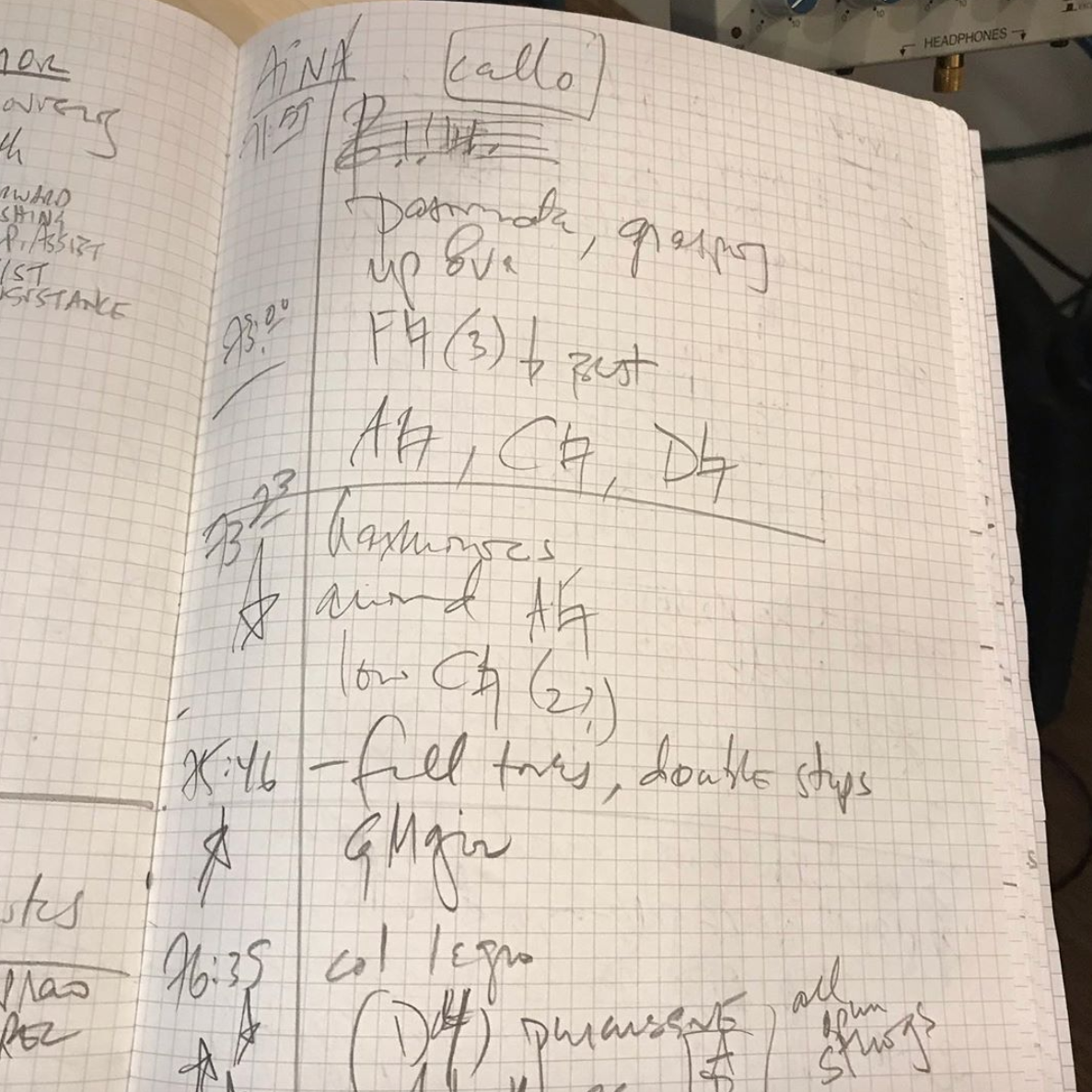 Everything you hear in the electronic score was originally played live by the GLO and recorded by me during individual meetings in June 2019. I engaged each player in conversation and asked them to demonstrate their instrument using three musical notes (D, E and G#) as the tonal locus for an improvisation. Each note and musical phrase was conceived without any knowledge of a whole. Over the next 6 months, I composed the piece out of snippets taken from 9-hours of recorded material, compositing them into an interlocking tapestry of music wherein the content dictates the form. I then created a visual rendering of the electronic score—a roadmap for live performance in which players engage in real time with recorded versions of themselves.